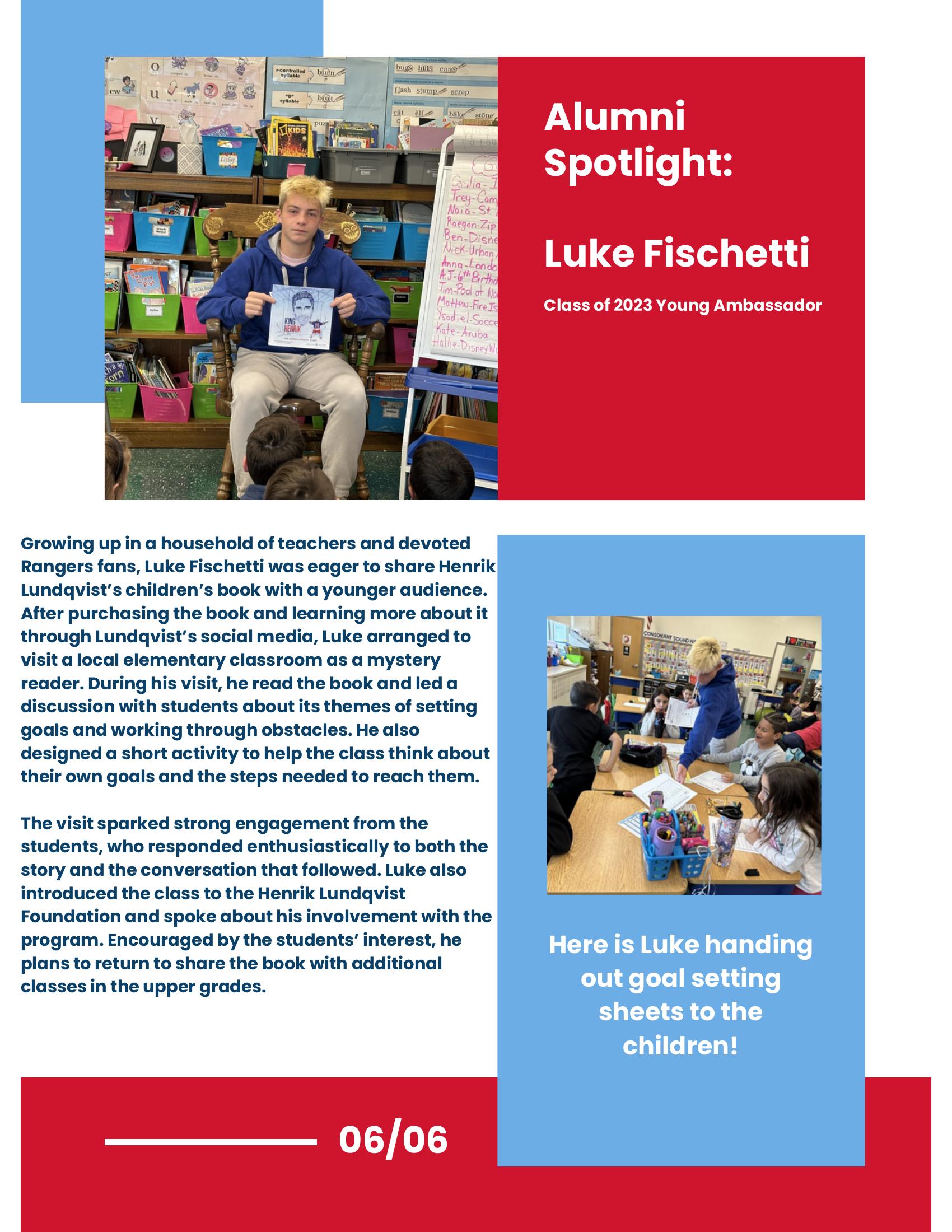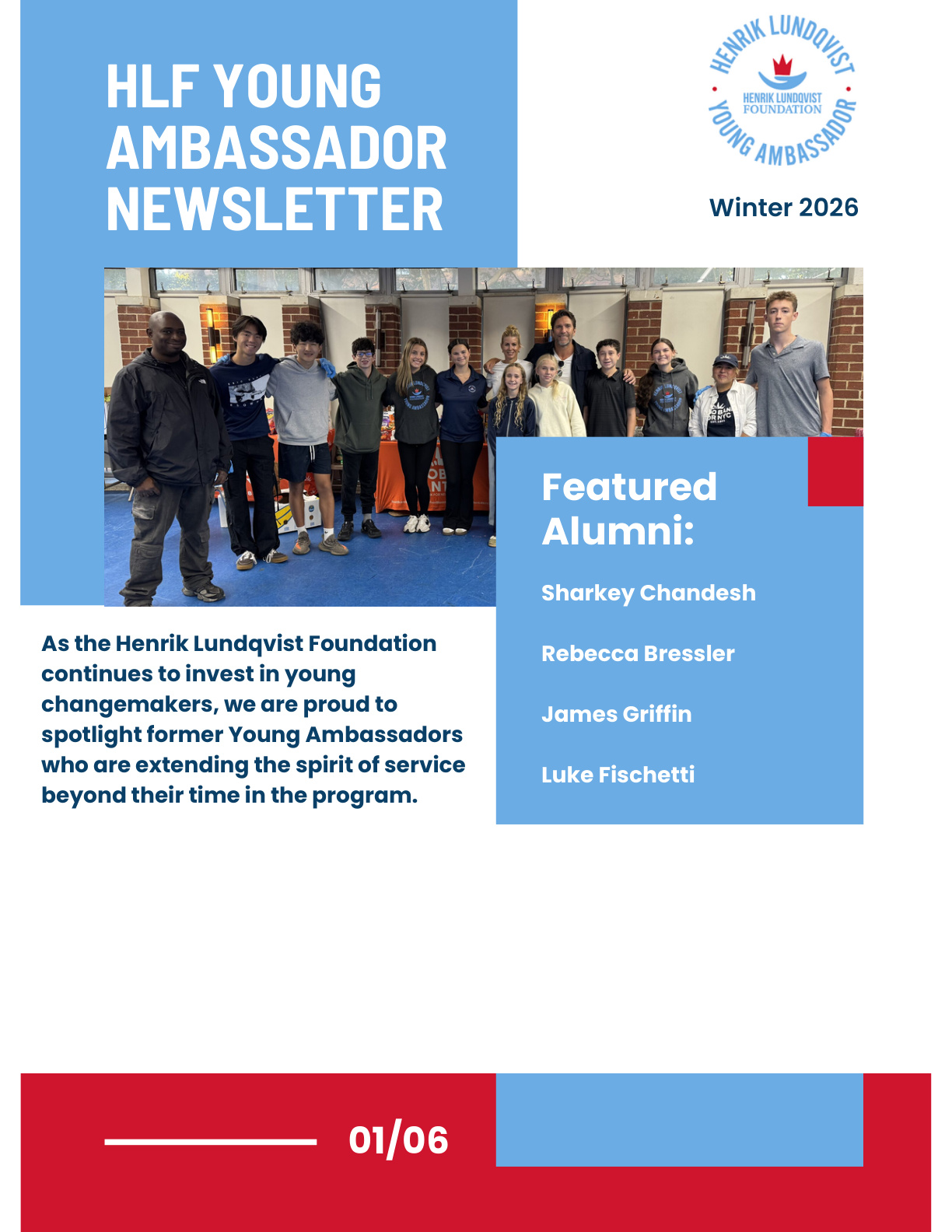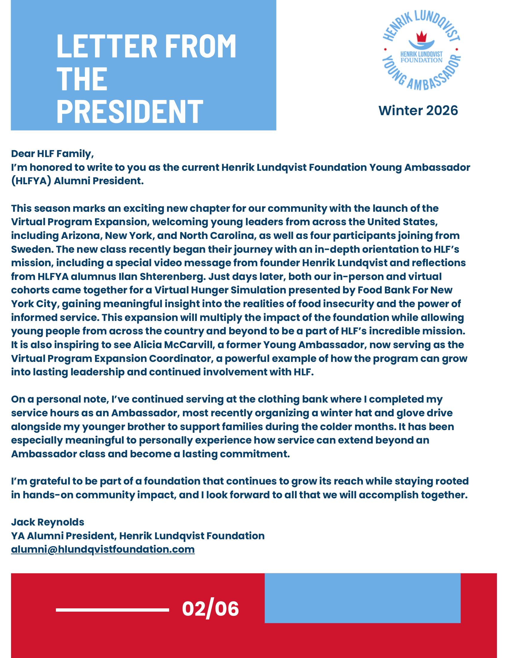 The second edition of the HLF Young Ambassador Newsletter celebrates what happens after the ambassador year ends. In this Winter 2026 issue, we spotlight alumni who are continuing to serve their communities in powerful ways, from expanding youth access to hockey and advancing inclusion through adapted sports, to organizing service projects on campus and inspiring elementary students through literacy and goal setting. The newsletter also features a letter from Alumni President Jack Reynolds, who reflects on the exciting launch of the Virtual Program Expansion and the growing reach of the Henrik Lundqvist Foundation’s mission.